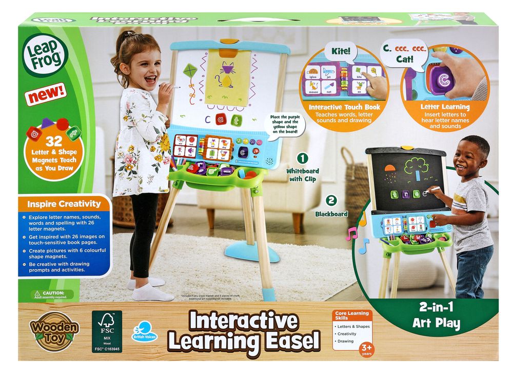LeapFrog Interactive Learning Easel gives children a fun new way to learn the alphabets, shapes and drawing. Use the 26 letter magnets and the letter reader to teach kids with the double-sided whiteboard. The touch-sensitive book includes inspirational images for every letter of the alphabet.